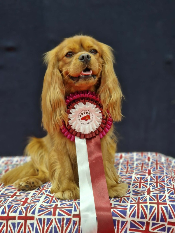 Front solide, excellente ossature en rapport, expression masculine, stop bien ouvert, excellente longueur de chanfrein, excellente articulation mâchoire, excellent crâne. Un peu enfoncé dans ses épaules. Dos solide, implantation du fouet très basse, excellente poitrine, qualité de fourrure, ruby riche, démarche jolie de profil mais très serrée à l'arrière.