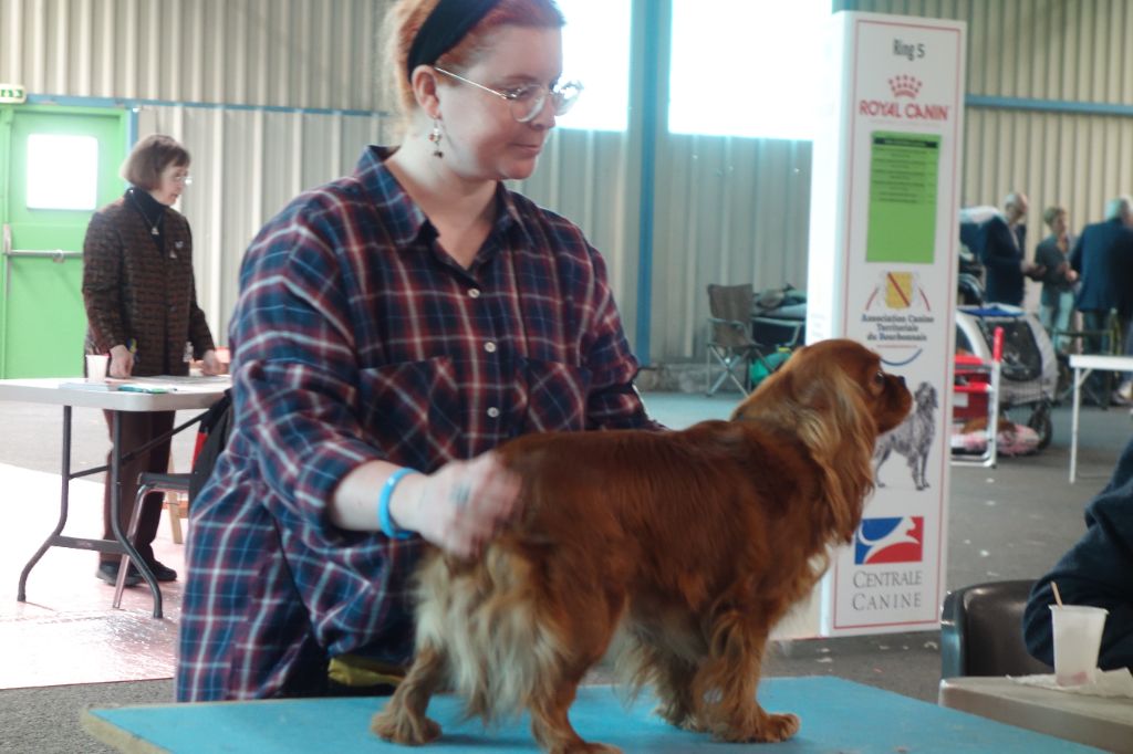 Excellent format, dentition en pince. Chanfrein un peu court, manque un peu d'encolure. Excellente angulation avant et arrière. A la marche, un peu timide dans le ring et croise de l'arrière.