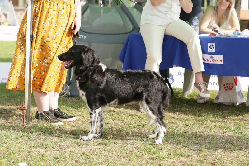 DCC, présentée un peu haut d'état, model plaisant dans le type, jolie tête et expression, oreille bien portée, de bonne longueur, encolure bien courte, excellent dessus, poitrine bien développée, excellente angulation avant et arrière, queue courte et cassée, se déplace correctement.