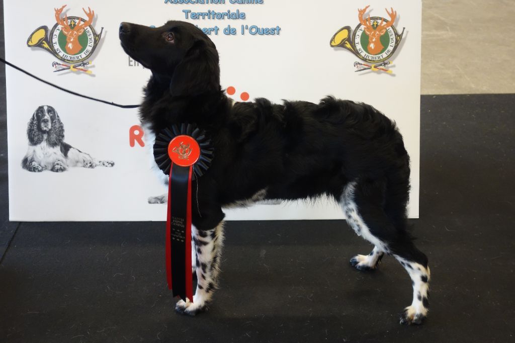 Tête féminine, yeux foncés, bonne ligne crâne et chanfrein. Bonne sortie encolure, excellente ligne de dos, excellente qualité de poils. Postérieurs bien angulés, mouvement correct, excellent caractère.