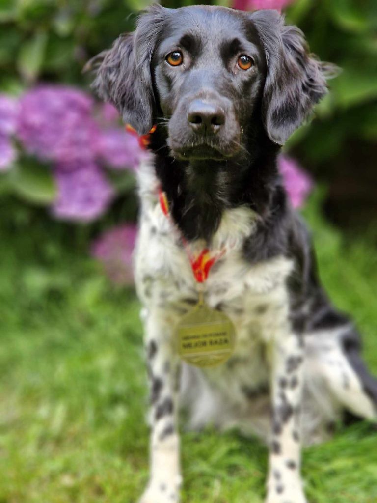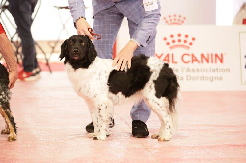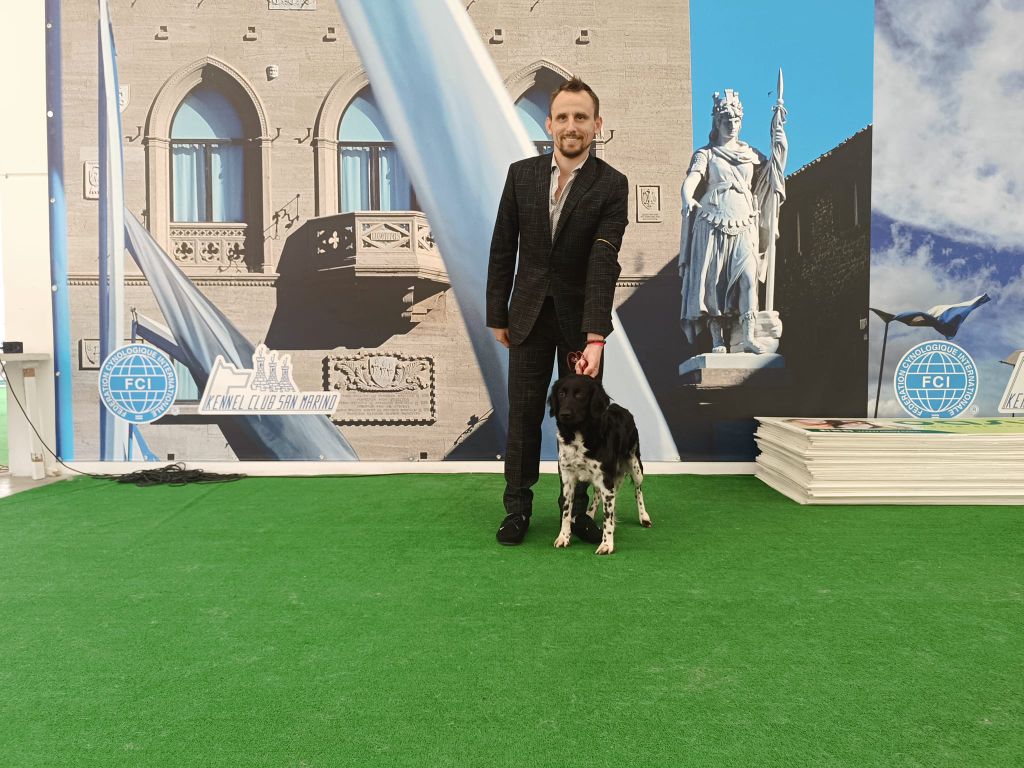 Joli sujet, bien construit dans un rectangle, conforme à sa race, excellent crâne et chanfrein, oeil bien pigmenté. Les aplombs sont bien parallèles, poitrine bien descendue et à sa place, ensemble bien angulé, excellents mouvements réguliers et typiques.